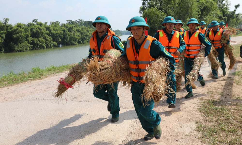 Lực lượng tham gia diễn tập vận chuyển vật tư xử lý tình huống phòng chống thiên tai. Ảnh: Trung Nguyên.
