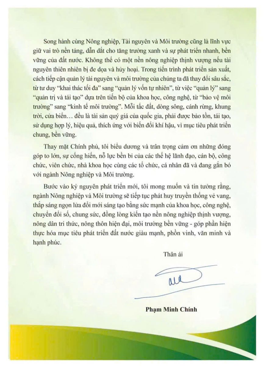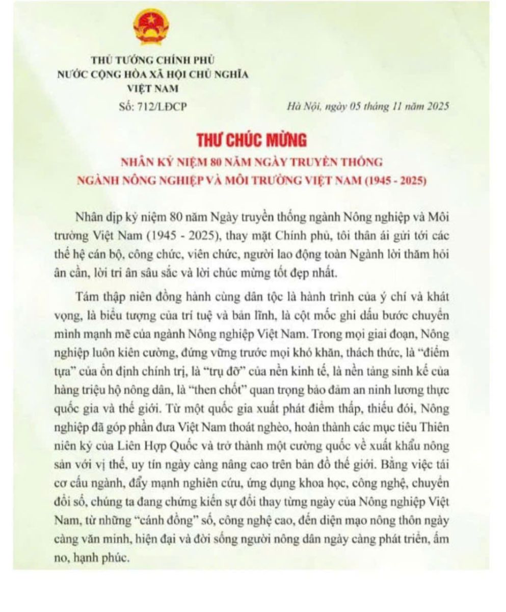 THƯ CHÚC MỪNG NHÂN KỶ NIỆM 80 NĂM NGÀY TRUYỀN THỐNG NGÀNH NÔNG NGHIỆP VÀ MÔI TRƯỜNG VIỆT NAM (1945 – 2025)