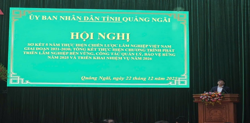Chiều ngày 22/12/2025, Ủy ban nhân dân tỉnh Quảng Ngãi tổ chức Hội nghị sơ kết 5 năm thực hiện Chiến lược Lâm nghiệp Việt Nam giai đoạn 2021 - 2030, định hướng đến năm 2050; tổng kết Chương trình phát triển lâm nghiệp bền vững và công tác quản lý, bảo vệ rừng, phòng cháy, chữa cháy rừng năm 2025; triển khai nhiệm vụ năm 2026.
